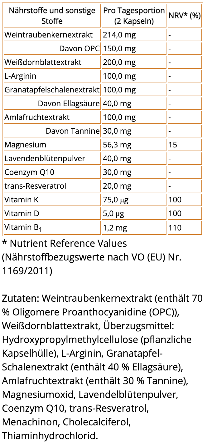 Oligomere Proanthocyanidine, kurz OPC, sind starke antioxidative Stoffe, die insbesondere in Weintraubenkernen zu finden sind. OPC hemmen im Körper das Enzym ACE – das gefäßverengende Faktoren aktiviert – und können somit zur Verbesserung des Blutdrucks beitragen.1 Hierbei handelt es sich um den gleichen Mechanismus zur Blutdrucksenkung, den sich viele Medikamente zunutze machen.